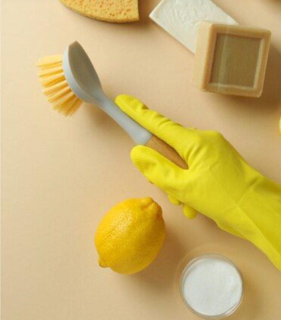 - Tvätta kakel på väggar, arbetsytor och diskbänk och kran.